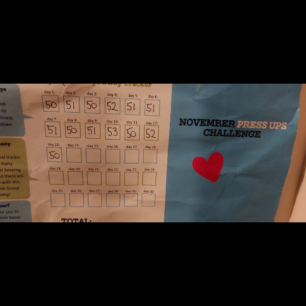 Friday 7th Nov I'm really enjoying this challenge. The pain in my arms and shoulders is easing a bit. A tough exercise for a great cause. Share