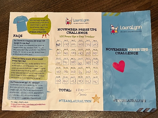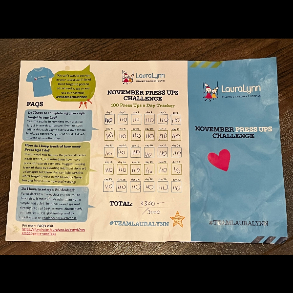 This November, I’m taking part in the November Press Up challenge to raise funds for LauraLynn, Ireland’s only Children’s Hospice. I’m taking on this challenge for children with life-limiting conditions, and their families, and would be grateful for your support.